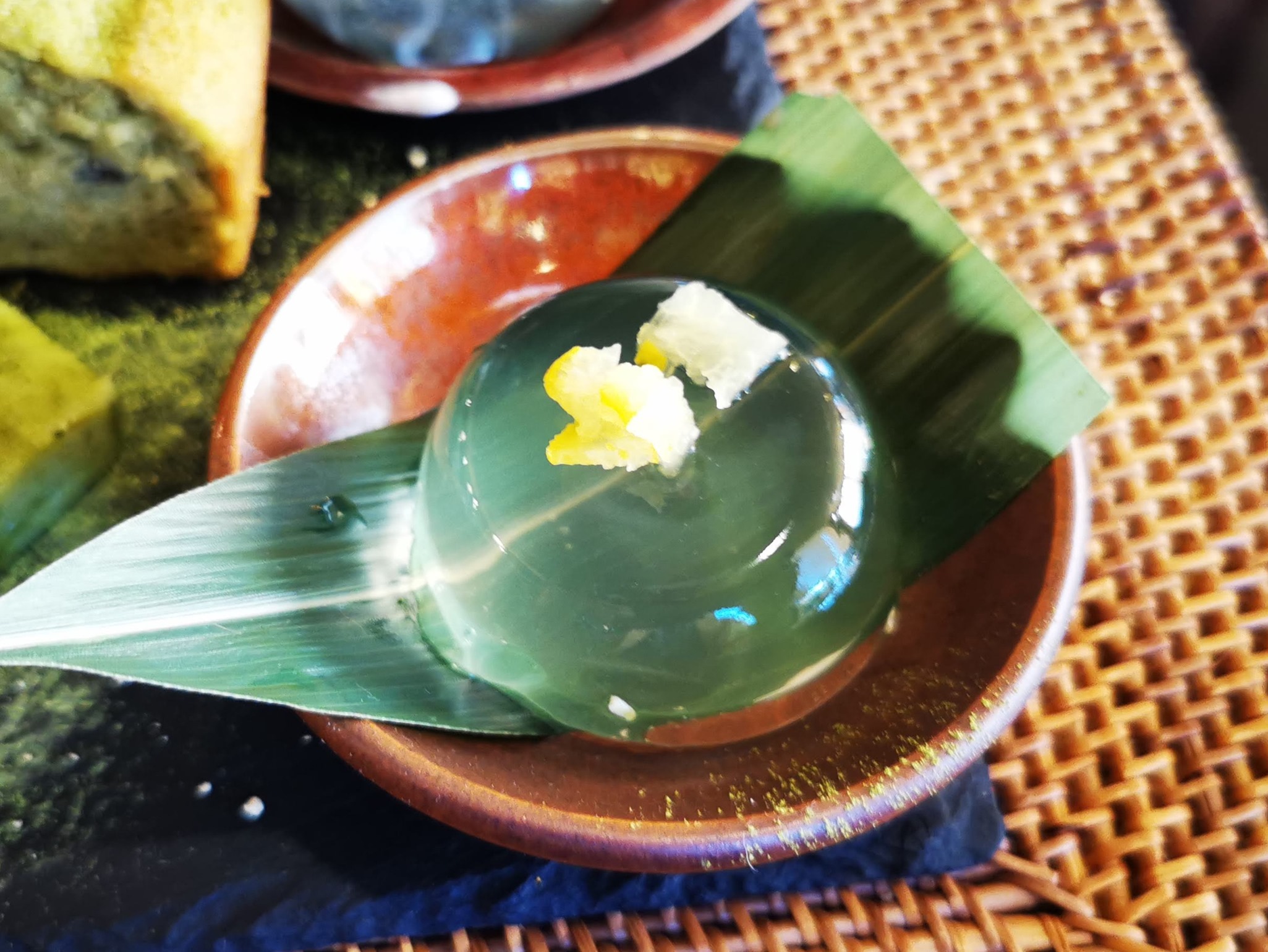 この水羊羹のようなものは、信玄餅を使いそれをアガーという海藻を使ったゼリーを使って固めているそうです。