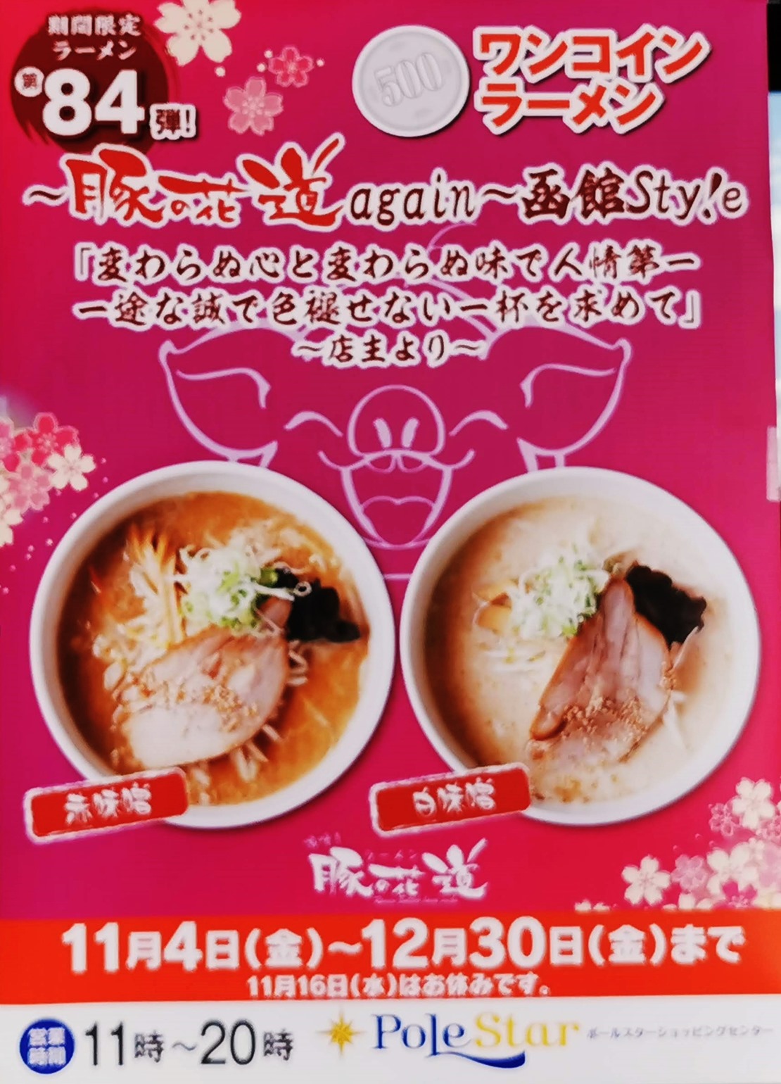 函館ポールスターの11月からの月替わりラーメンは札幌「豚の花道」の登場です。
