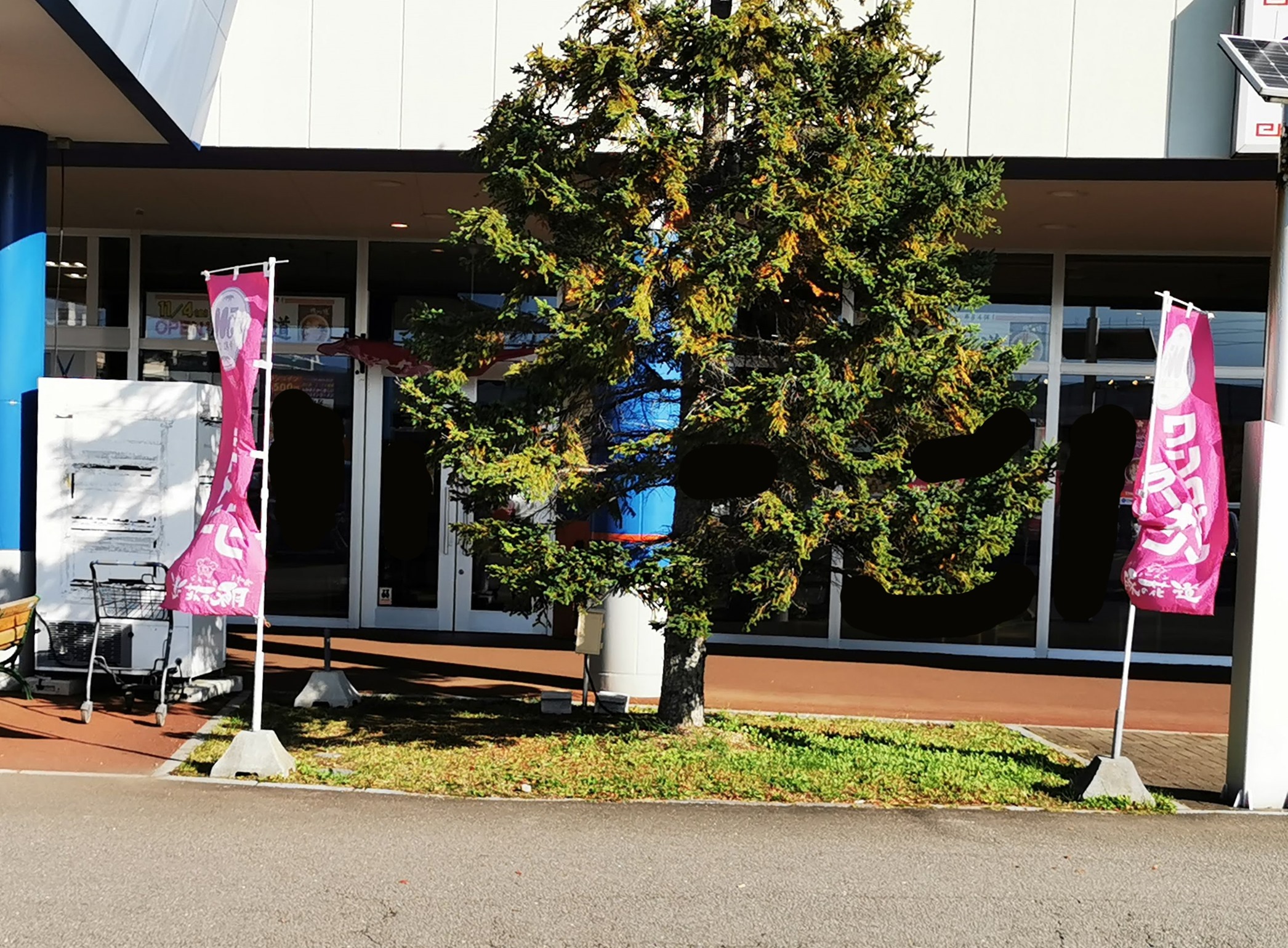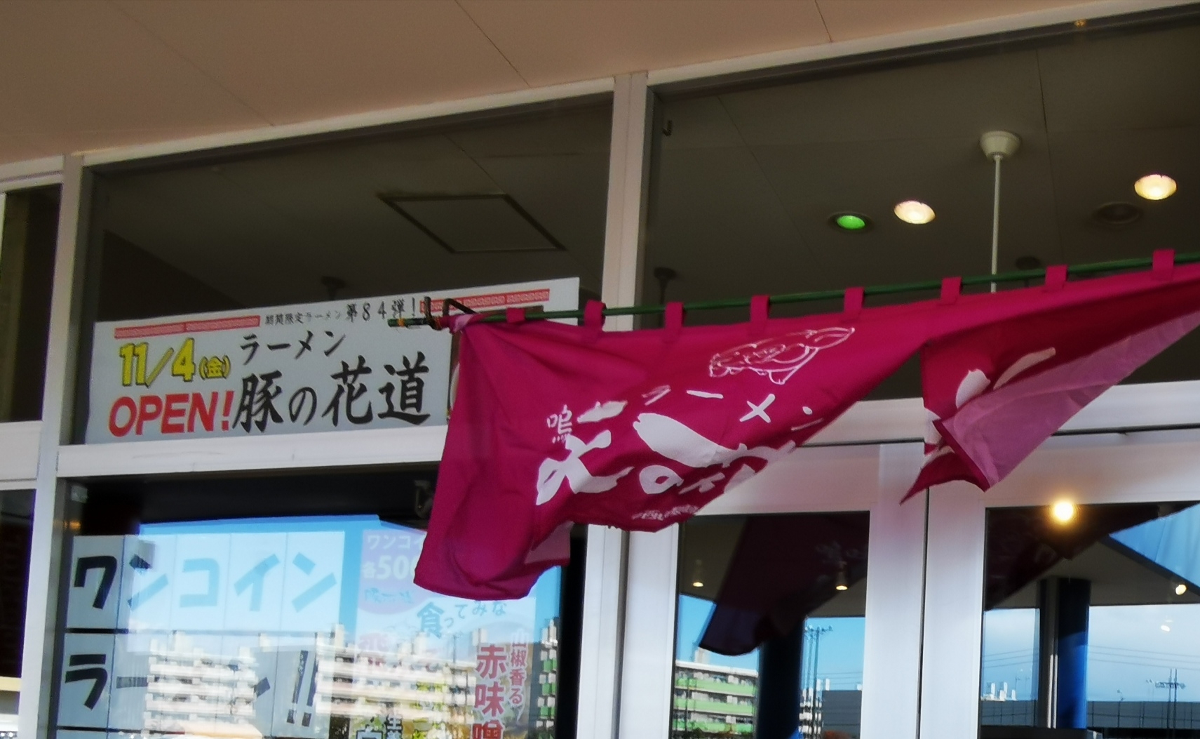 ワンコインラーメンのノボリがなびいています。