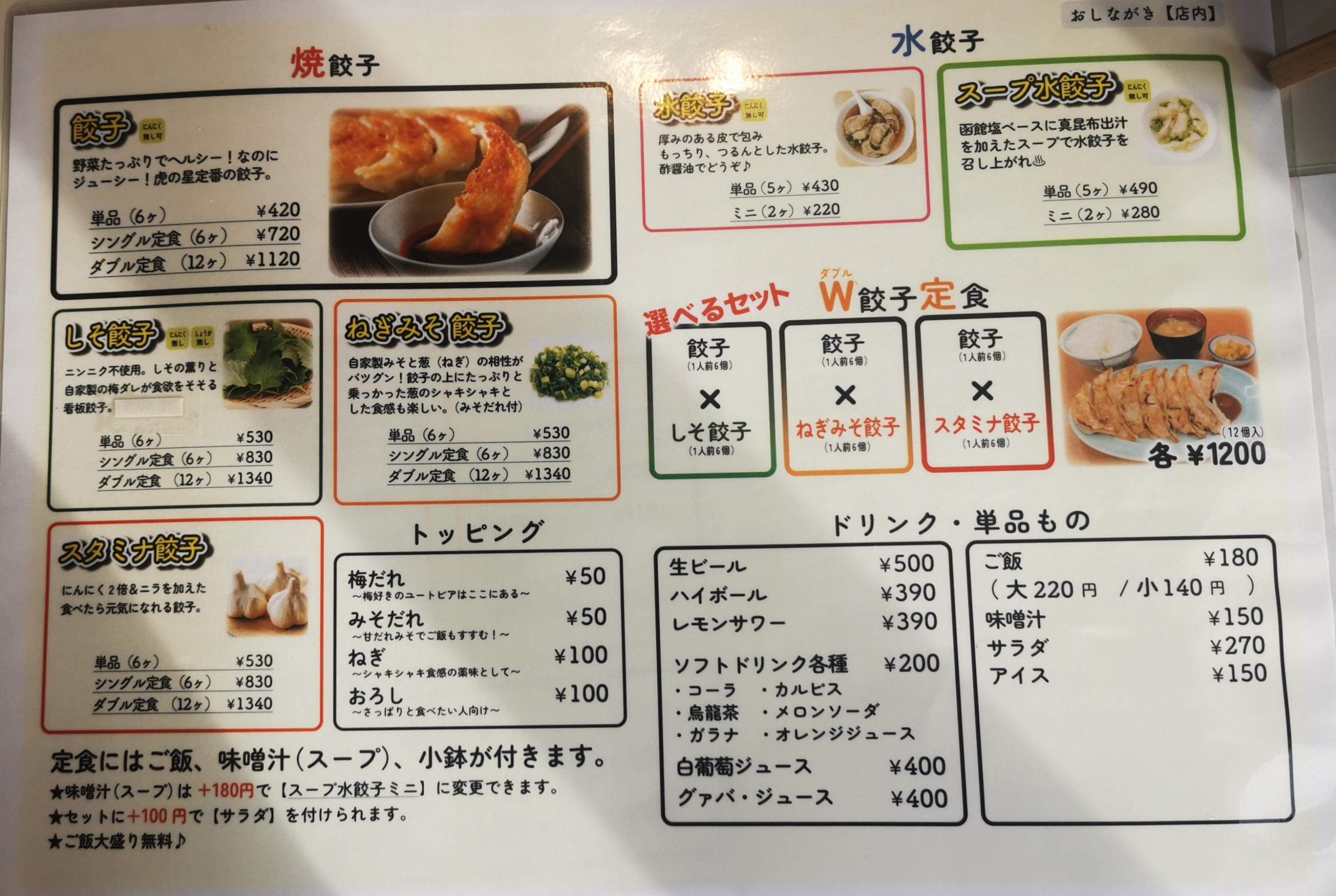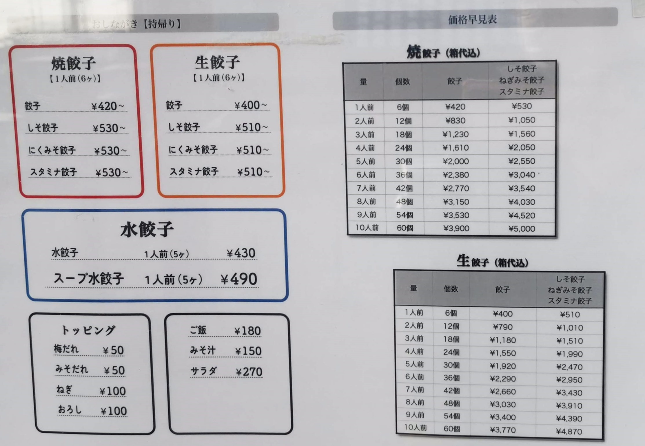 普通の餃子6個 420円、スタミナ餃子 530円です。