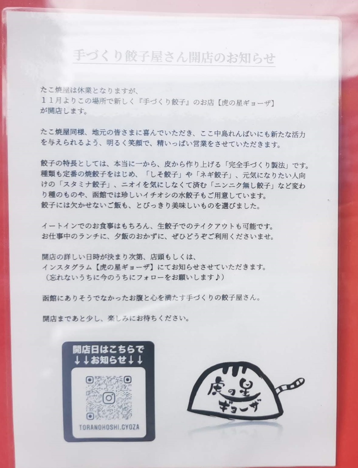 11月22日中島廉売にオープンした「虎の星ギョーザ」です。