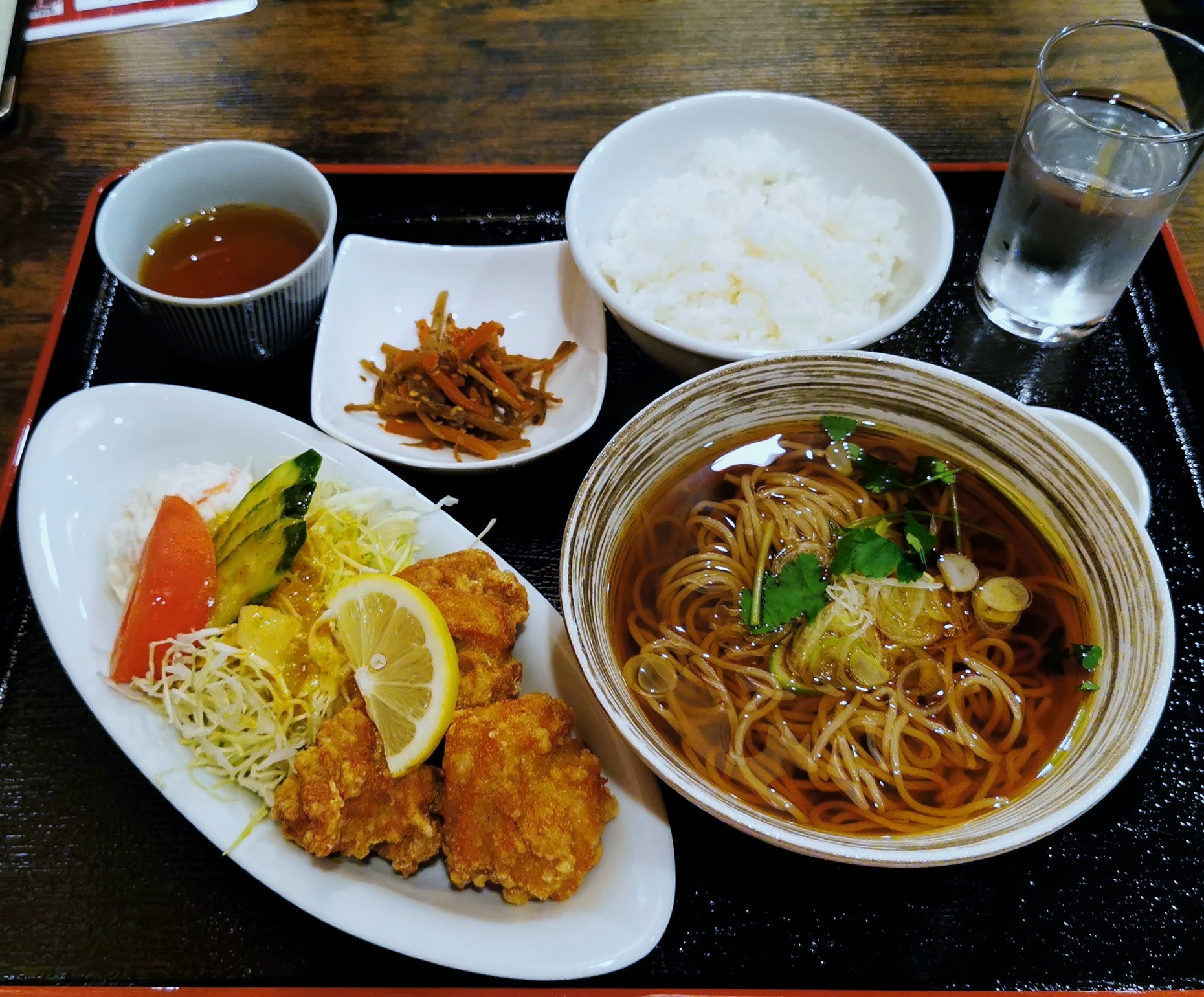 こちらがオープン記念ランチの「鶏のから揚げ、かけそば定食」です。1000円