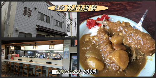 長万部の「天ぷら店 幹」でのランチ。ここは日替わりランチを提供していて、この日は海老フライカレーでした。皿をけっこう覆っている大きな海老フライが2本入っていて嬉しくなります。600円と値段も安いんです。