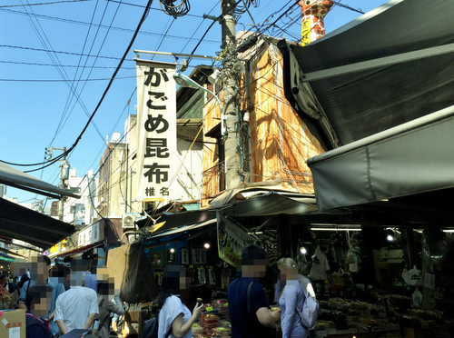 がごめ昆布の看板がしっかりありまして、まるで函館朝市のような感じですが、ここは築地でした。 いいですね〜、がごめ昆布。しっかりと全国区なんですね。(^^) がごめ昆布に、今度は、カキ小屋だそうでして、これは、まるで知内です。笑 バフン